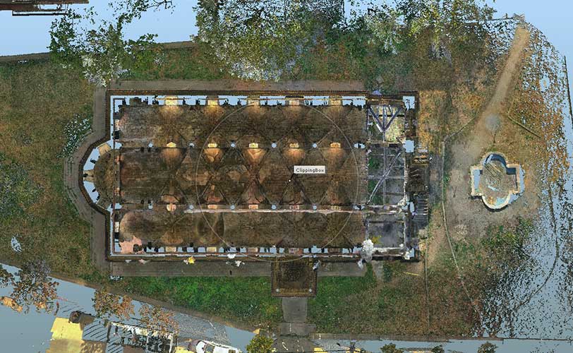 Yapının çatısı, avlular, arka cepler, ulaşılması zor bölümler yüksek çözünürlüklü görüntülerle belgelenir.